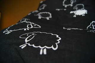 No właśnie Czarna Owca chyba mnie prześladuje, albo to wszystko spowodowane jest tęsknotą za środowymi spotkaniami. Otóż jak tylko weszłam do sklepu z tkaninami i zobaczyłam materiał w ten cudowny wzorek wiedziałam, że muszę go kupić :) I tak oto popełniłam dwie poszewki. Wiem, że to nie jest mistrzostwo świata, ale jak na kogoś kto dopiero zapoznał się z obsługą maszyny wyszło całkiem, całkiem... tak więc teraz całe stadko towarzyszy mi codziennie... :D